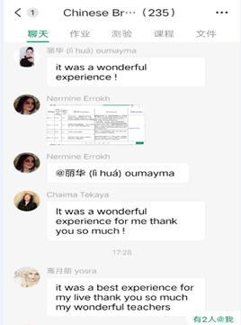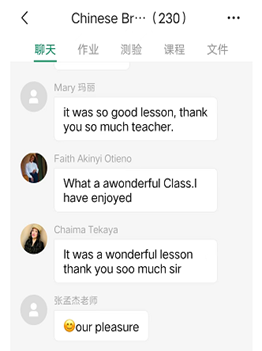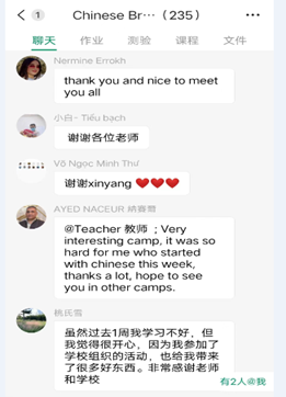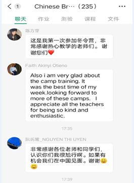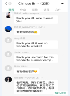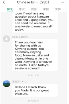 外国学员们通过直播课程与我校教师同频交流,亲身感受了中国文化,学习了汉语知识,收获满满,给予我校团组教师高度评价。今后,我们将更加努力创新交流方式和渠道,向更多外国朋友和学生介绍中国文化、河南风情、信阳特色,并通过汉语这一媒介,不断扩大我们的朋友圈,增进不同文明间的交流。