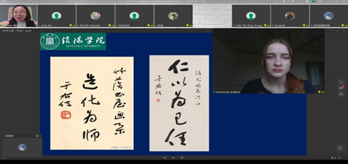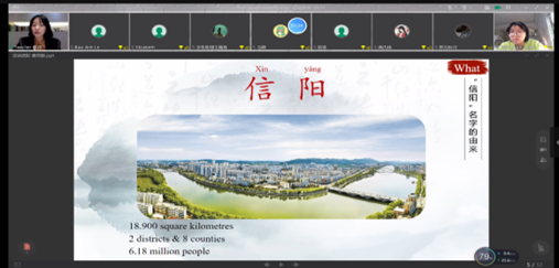 田冲老师授课心得:通过本次汉语桥线上团组活动,我有以下体会:首先,教学内容上既有知识学习,又有参与体验,理论与实践相结合,在短时间内,让外国学生对信阳有了基本的认识,并产生了兴趣。其次,虽然我多次参加过类似活动,但针对海外学生的线上教学还是首次。所以,如何最大程度地调动学生参与教学的积极性是我今后需要认真思考的问题。第三,在教学活动中,我发现信阳有着优秀的传统文化资源,海外学生对中国传统文化有着浓厚的兴趣,如何将这些优秀资源通过线上的形式传播出去,让世界认识中国、了解中国优秀文化是值得探讨的问题。第四,我在教学中发现了个人知识的不足。例如,今后要认真学习英语,提高英语沟通能力。最后,感谢学校提供了与外国学生交流的机会和平台,希望今后能参与更多类似的项目。