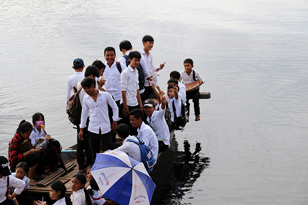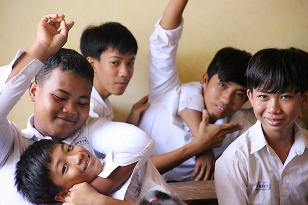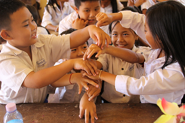 骑着自行车沿着学校门口的小路往深处去,有几家本地的小饭馆,沿着甘再河而设,大伙都俗称“木瓜亭”。有一次,学生请我去木瓜亭吃东西,刚开始还是有些害羞,席地而坐以后,大家聊起天来才放开了心。学生告诉我:“我的妈妈谢谢老师能来柬埔寨教我读书,谢谢老师!”我听了以后,心里真的百转千回。是啊,在这里,能帮他们一分是一分,条件虽然艰苦,但是我一直都在尽我所能让他们对中文感兴趣,不止唱歌跳舞,还用游戏引导他们。吃完零食,我们一起去玩我小时候最爱玩的游戏“三个字”。大家奔跑得不亦乐乎,我也给孩子们买甘蔗汁解暑。那真是快乐的一个下午。
